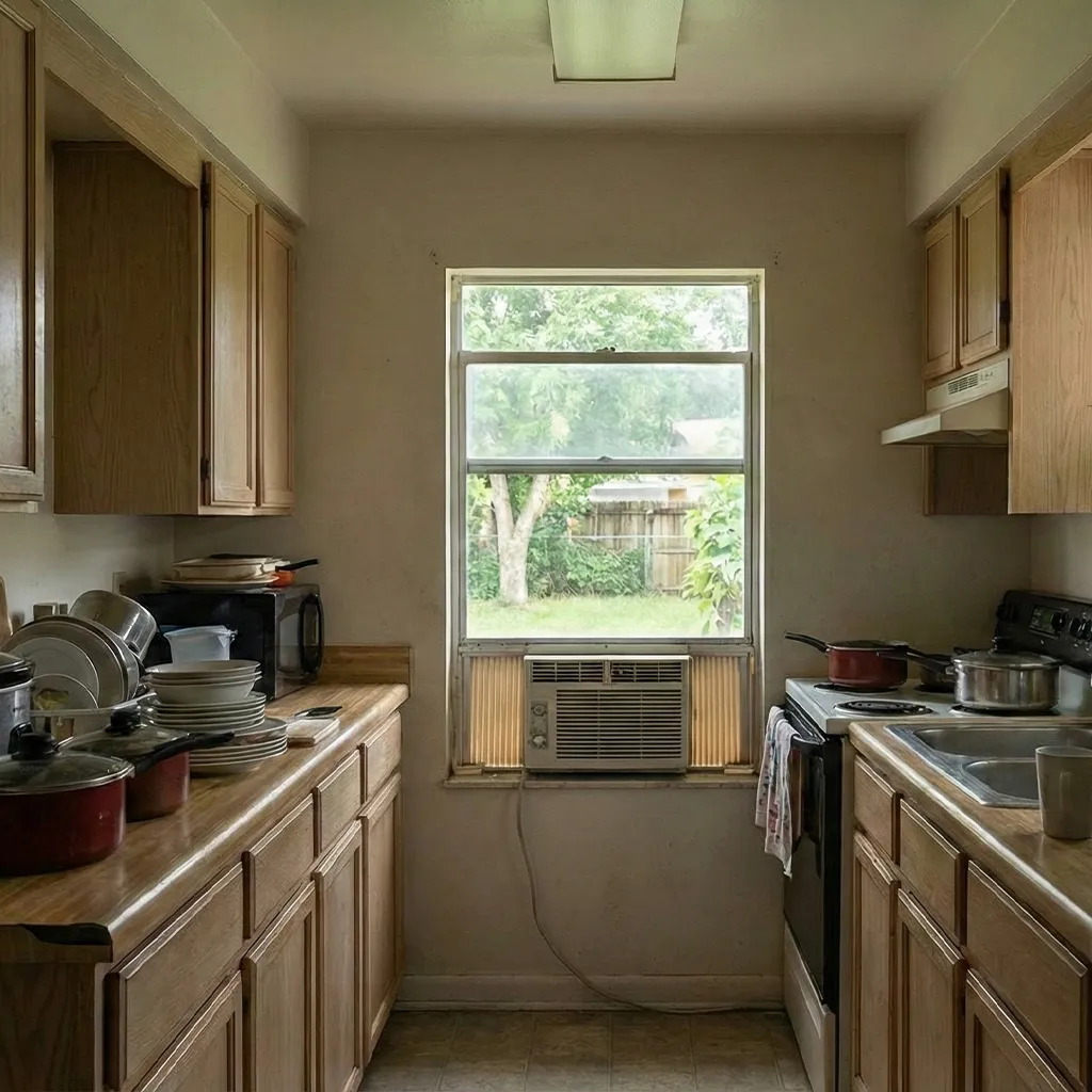 Small galley kitchens stuffed onto the back of the house, often created as afterthoughts with poor layouts.